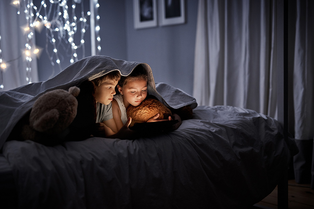 Children, tablet and blanket on bed at night streaming cartoons, online gaming or watching movies for bonding. Kids, teddy bear and digital tech for ebook, video subscription and playing app in home