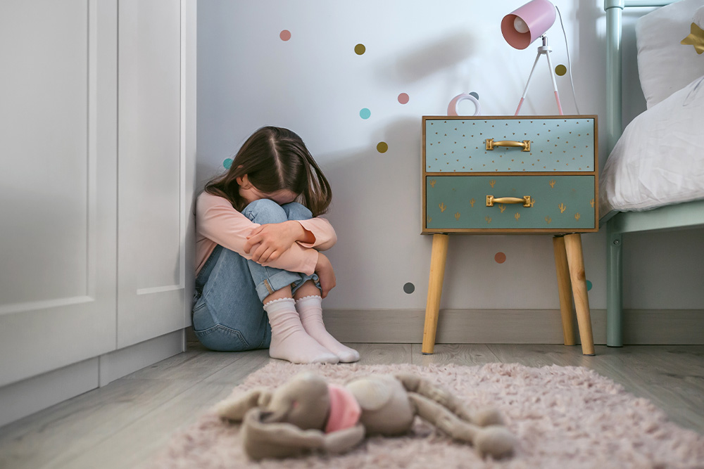 Frightened girl hugs a teddy bear